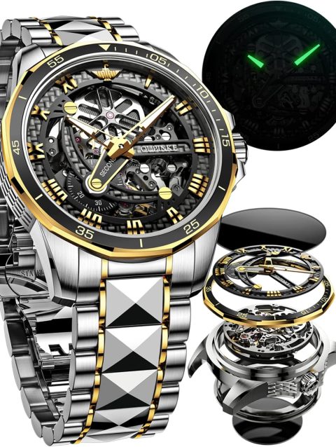 OUPINKE Mens Watches Skeleton Automatic Mechanical Premium with Calendar Sapphire Crystal Tungsten Steel Waterproof Wrist Watch