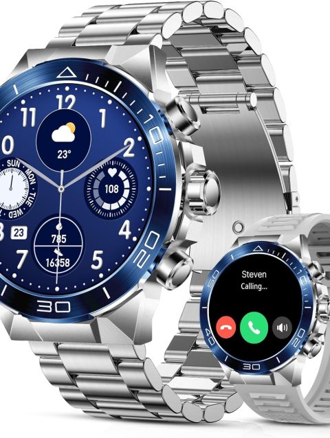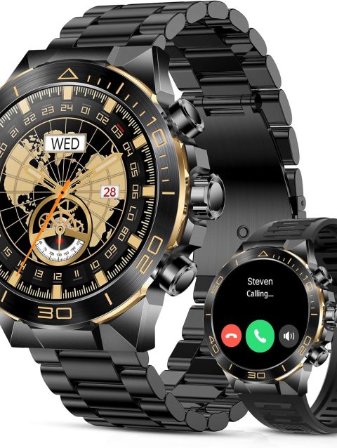 Smart Watch for Men Answer/Make Call for Android iPhone, 1.43″ AMOLED HD Screen Mens Luxury Watch, 400mAh Heavy Duty Smartwatch Heart Rate Blood Oxygen Blood Pressure Sleep Monitor Pedometer, 2 Straps