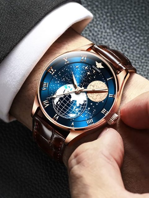 OBLVLO Luxury Designer Mens Earth Dial Leather Automatic Watch Three Wheels Stainless Steel Case Blue Luminous Leather Mechanical Wristwatch JM-Earth