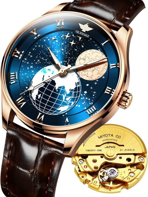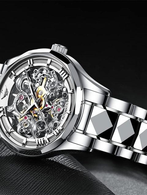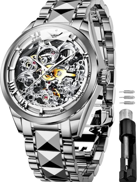 OUPINKE Men’s Skeleton Mechanical Watches Luxury Dress Automatic Self Winding Sapphire Crystal Waterproof Tungsten Steel Band Wrist Watches