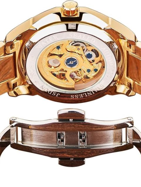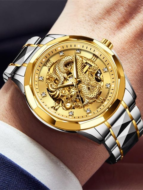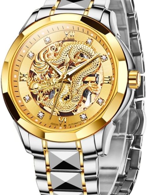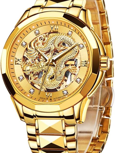 JSDUN Men’s Watch Automatic Mechanical Hollow Dragon Watch Luxury Formal Gold Diamond 50M Waterproof Tungsten Steel Luminous Watch