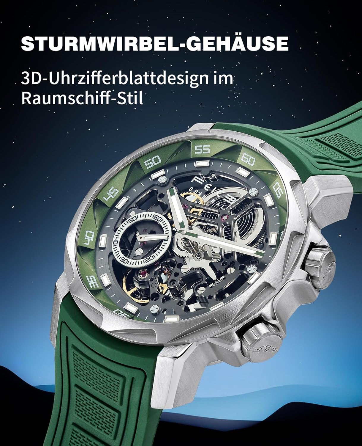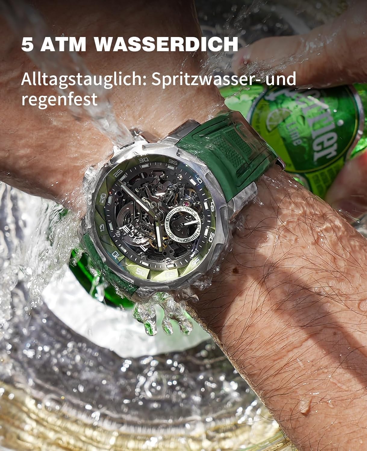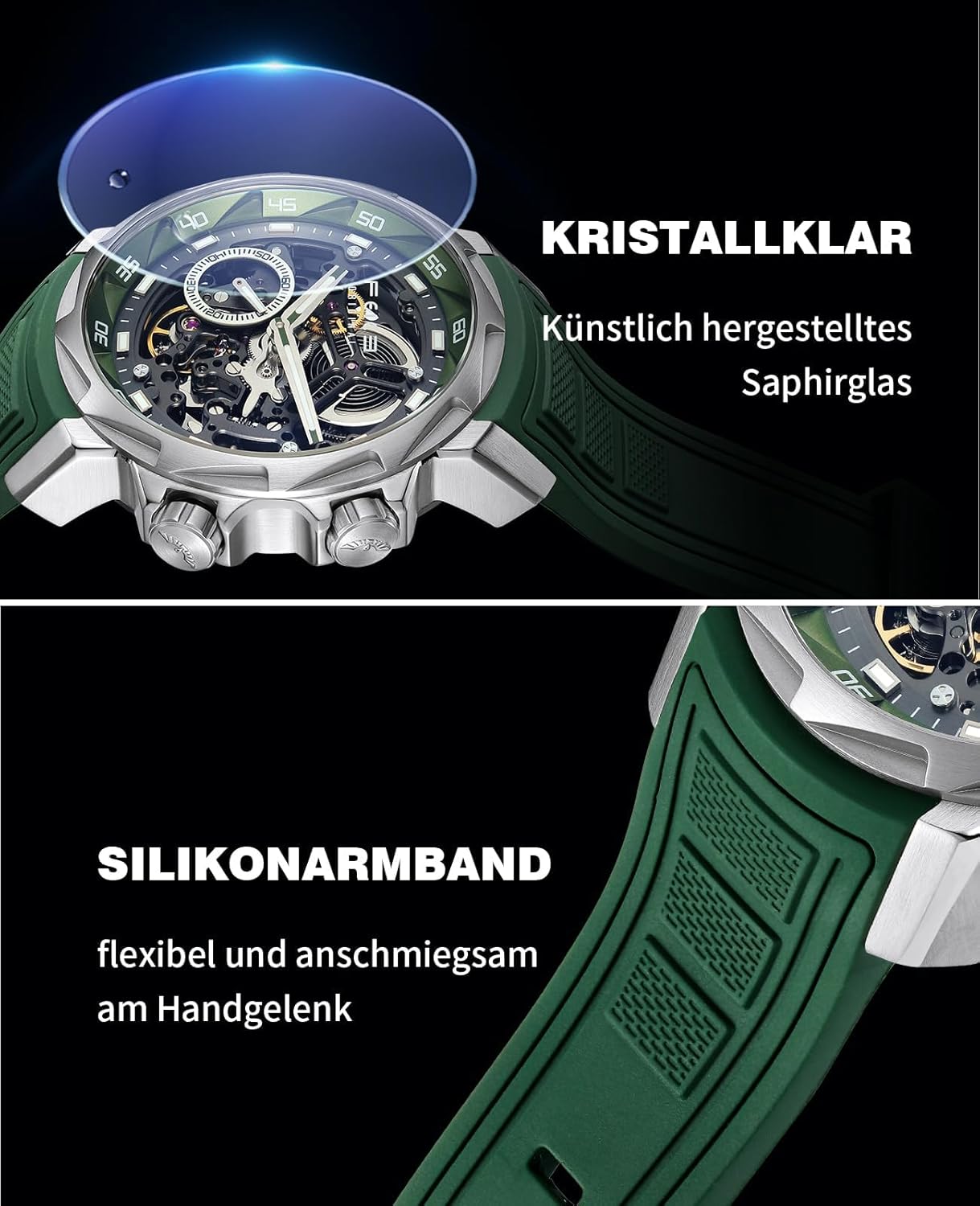 Add to cartFEICE FM511 GREEN Men’s Automatic Skeleton Watch, Luxury Sapphire Crystal Glass Blue Dial Luminous Hands, 5ATM Waterproof Sport Wristwatch with Silicone Strap for Men, Casual Mechanical Watches For Men.
