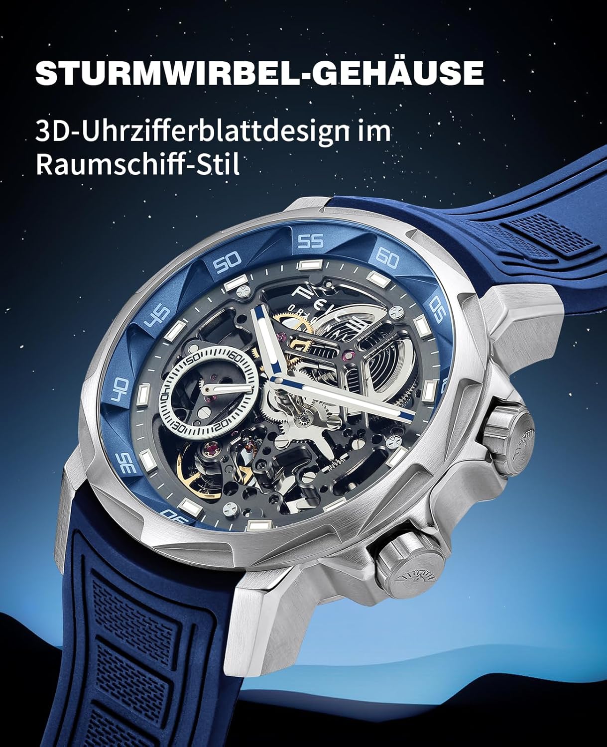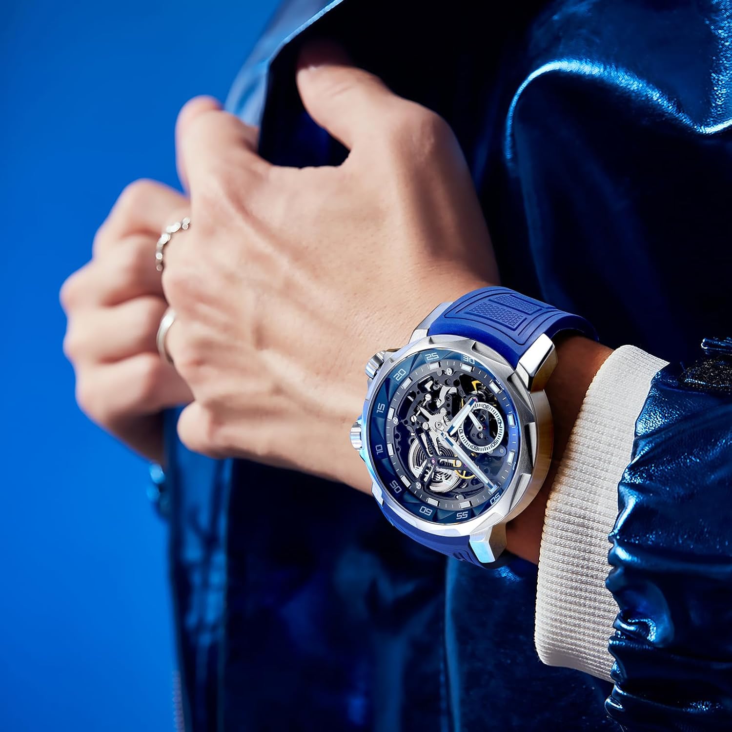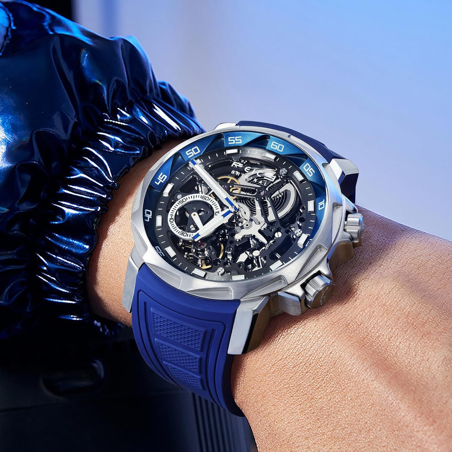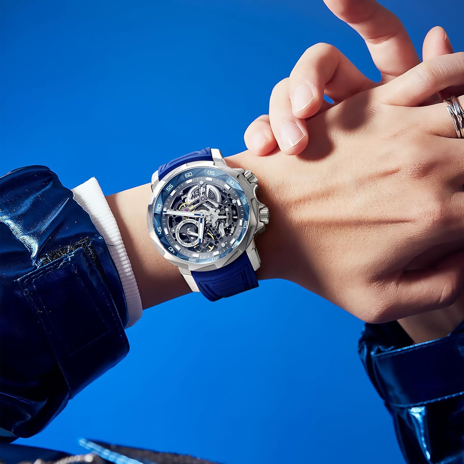 Add to cartFEICE FM511 Men’s Automatic Skeleton Watch, Luxury Sapphire Crystal Glass Blue Dial Luminous Hands, 5ATM Waterproof Sport Wristwatch with Silicone Strap for Men, Casual Mechanical Watches for Men.