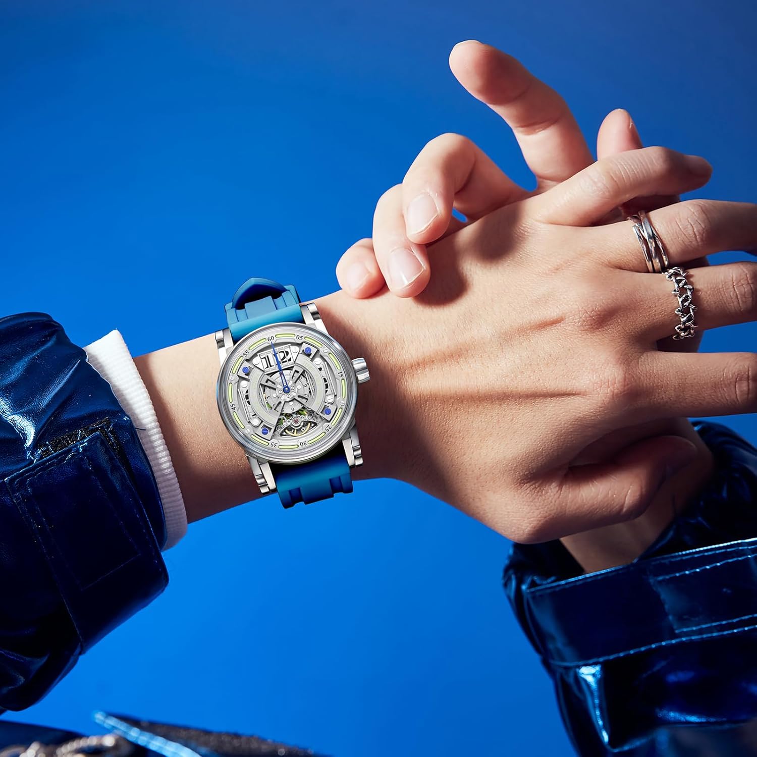 FEICE Watch for Men’s Automatic Mechanical Skeleton Watch Titanium Steel 50M Waterproof Mens Wristwatch Luminous Analog Watches No Battery Silicone Strap, FM501 Blue