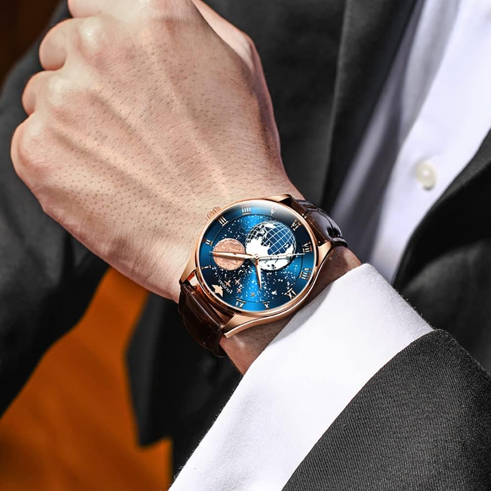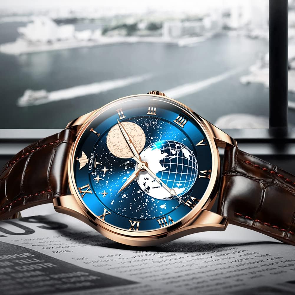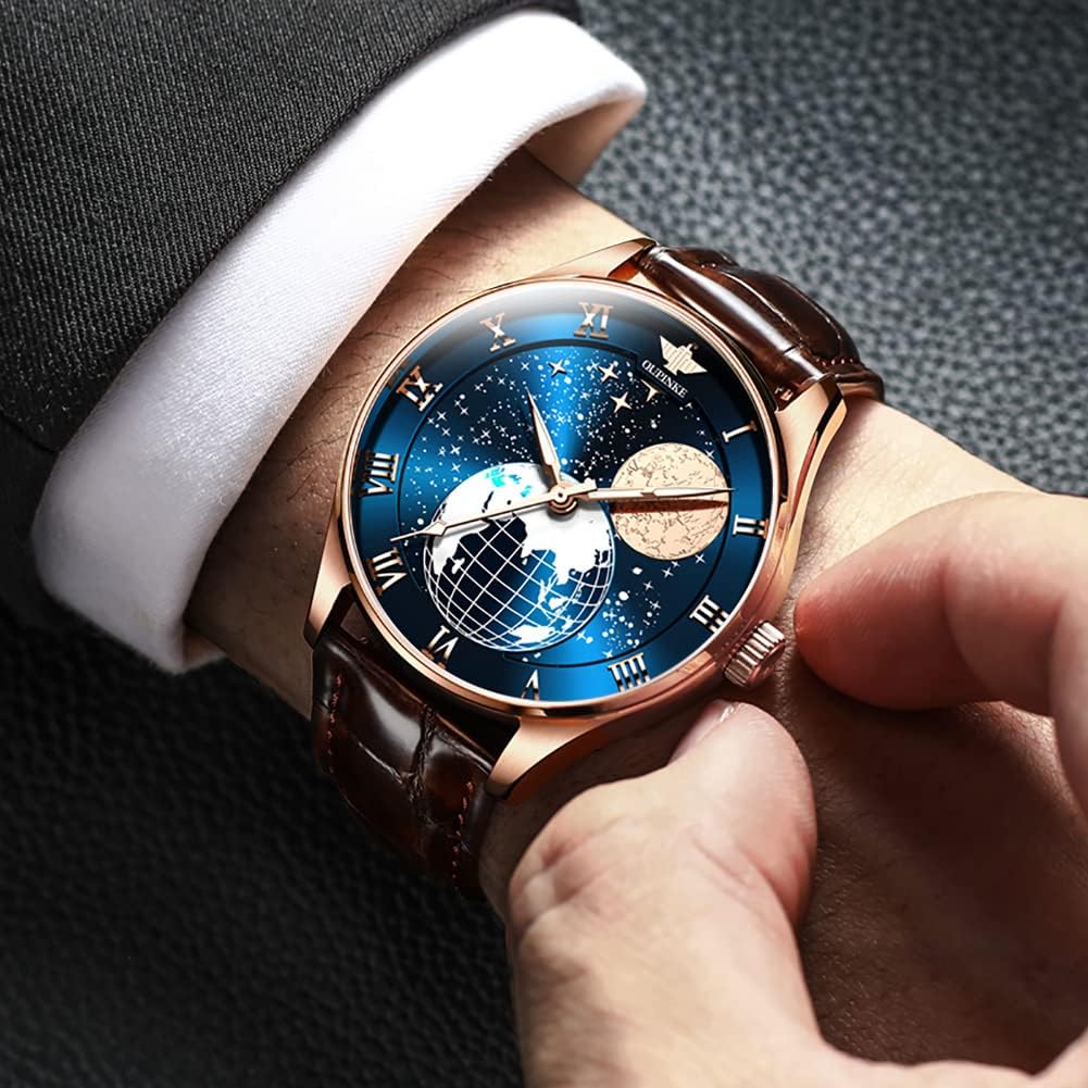 OBLVLO Luxury Designer Mens Earth Dial Leather Automatic Watch Three Wheels Stainless Steel Case Blue Luminous Leather Mechanical Wristwatch JM-Earth
