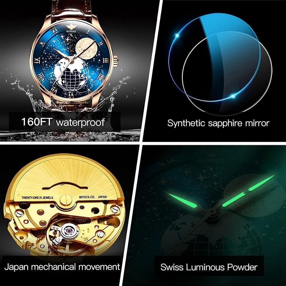 OUPINKE Mens Watches Skeleton Automatic Mechanical Premium with Calendar Sapphire Crystal Tungsten Steel Waterproof Wrist Watch
